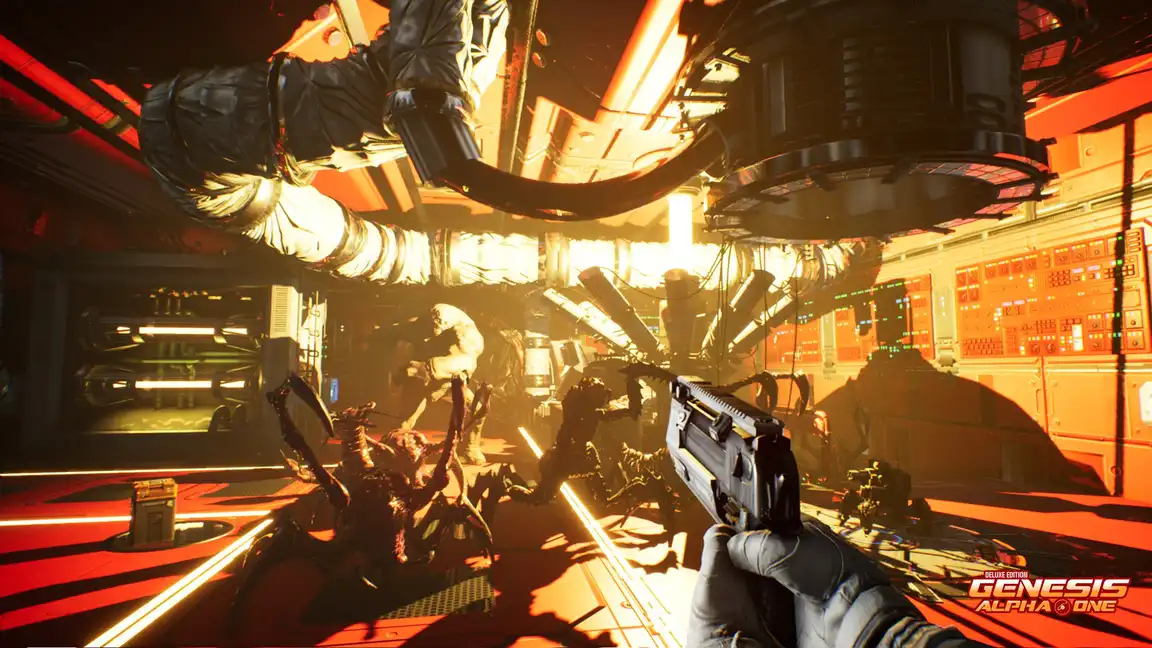 Engage in intense first-person shooting combat, build and manage your ship, carefully allocate resources, and fend off terrifying alien infestations. Clone new creatures to bolster your crew and adapt to the ever-changing dangers of space as you navigate the cosmos in Genesis Alpha One Deluxe Edition.
